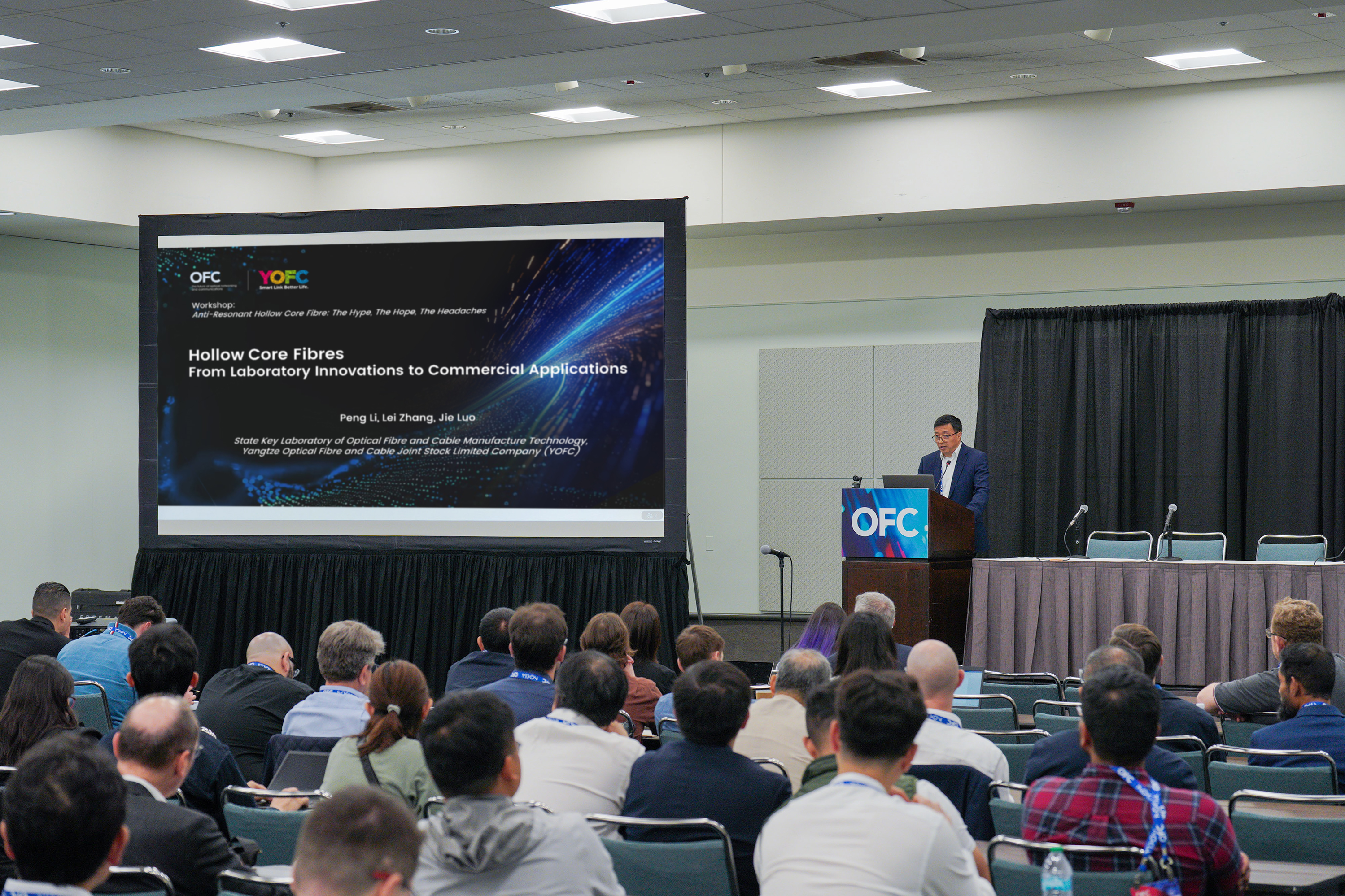 Luo Jie, diretor técnico da YOFC e diretor do Laboratório Nacional de Tecnologias de Fabrico Avançado e Aplicações de Fibras Ópticas e Cabos Ópticos (abreviado para “Laboratório Nacional de Fibras Ópticas”), foi convidado a participar no seminário temático “Anti-Resonant Hollow Core Fibre: The Hype, The Hope, The Headaches”, onde apresentou uma comunicação intitulada “Hollow Core Fibres: From Laboratory Innovations to Commercial Applications”.
